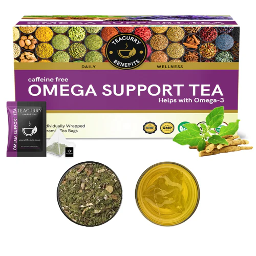 Omega Support Tea is a powerful blend of natural herbs and plant-based ingredients rich in omega 3 fatty acids, designed to support overall wellness. Packed with the best omega 3 vegan supplements, this herbal tea offers numerous health benefits. Omega 3 fatty acids are essential for a healthy heart, brain, and immune system. The omega 3 fatty acids benefits include improving cardiovascular health, reducing inflammation, and supporting cognitive function. In addition, the omega 3 fatty acid benefits for hair include promoting stronger, shinier, and healthier hair by nourishing the scalp and stimulating hair growth. Incorporating Teacurry Omega Support Tea into your daily routine also brings omega fatty acids benefits to your skin and eyes. It helps reduce dry eye syndrome and improves visual acuity, making it an excellent choice for those looking for omega 3 fatty acid for eyes support. Furthermore, the tea serves as a natural omega multivitamin, packed with omega vitamins like omega 3 vitamin D and omega 3 vitamin E, which are crucial for bone health, skin regeneration, and immune support. For expectant mothers, the omega 3 fatty acids benefits for pregnancy are particularly significant, as they support fetal brain and eye development while helping to reduce the risk of preterm birth. Additionally, the tea’s rich omega content assists in managing weight, making it a perfect complement to your wellness routine. The omega 3 fatty acids benefits for weight loss include reducing hunger, enhancing metabolism, and aiding fat burning. Teacurry Omega Support Tea is not only an excellent source of omega fatty acids vitamins but also a well-rounded addition to any diet, ensuring you get the best omega three vitamins in a delicious, vegan-friendly form.